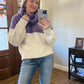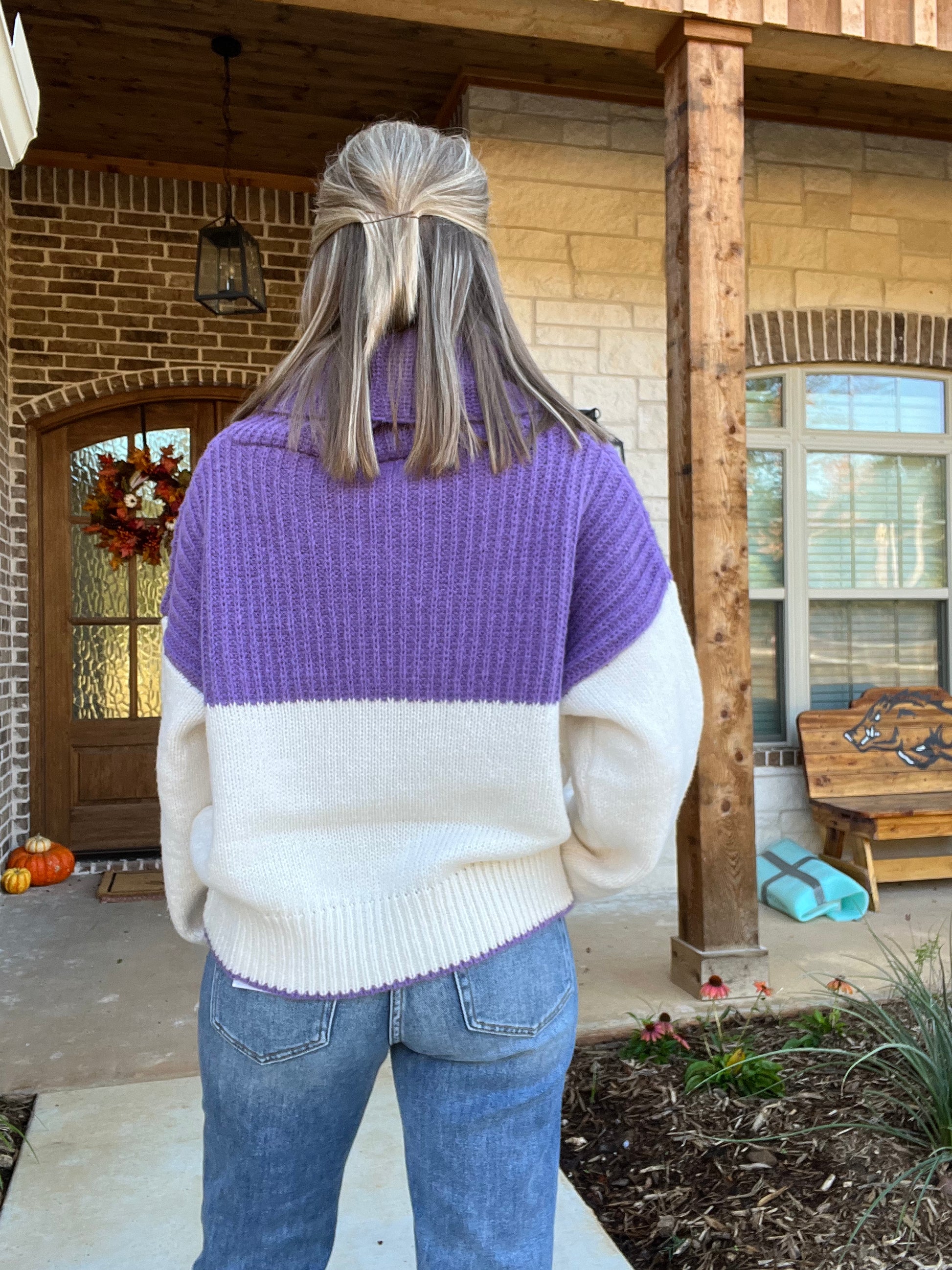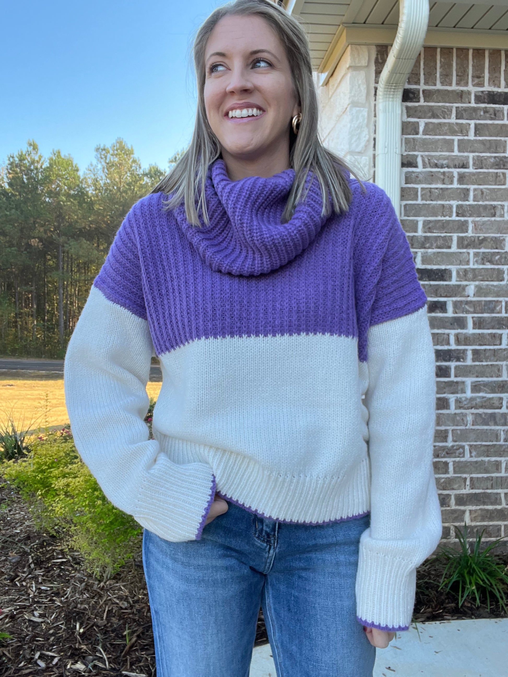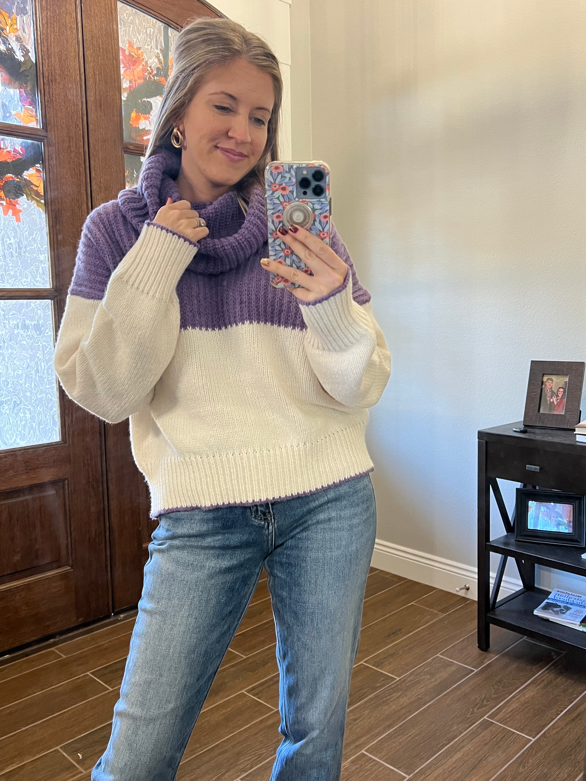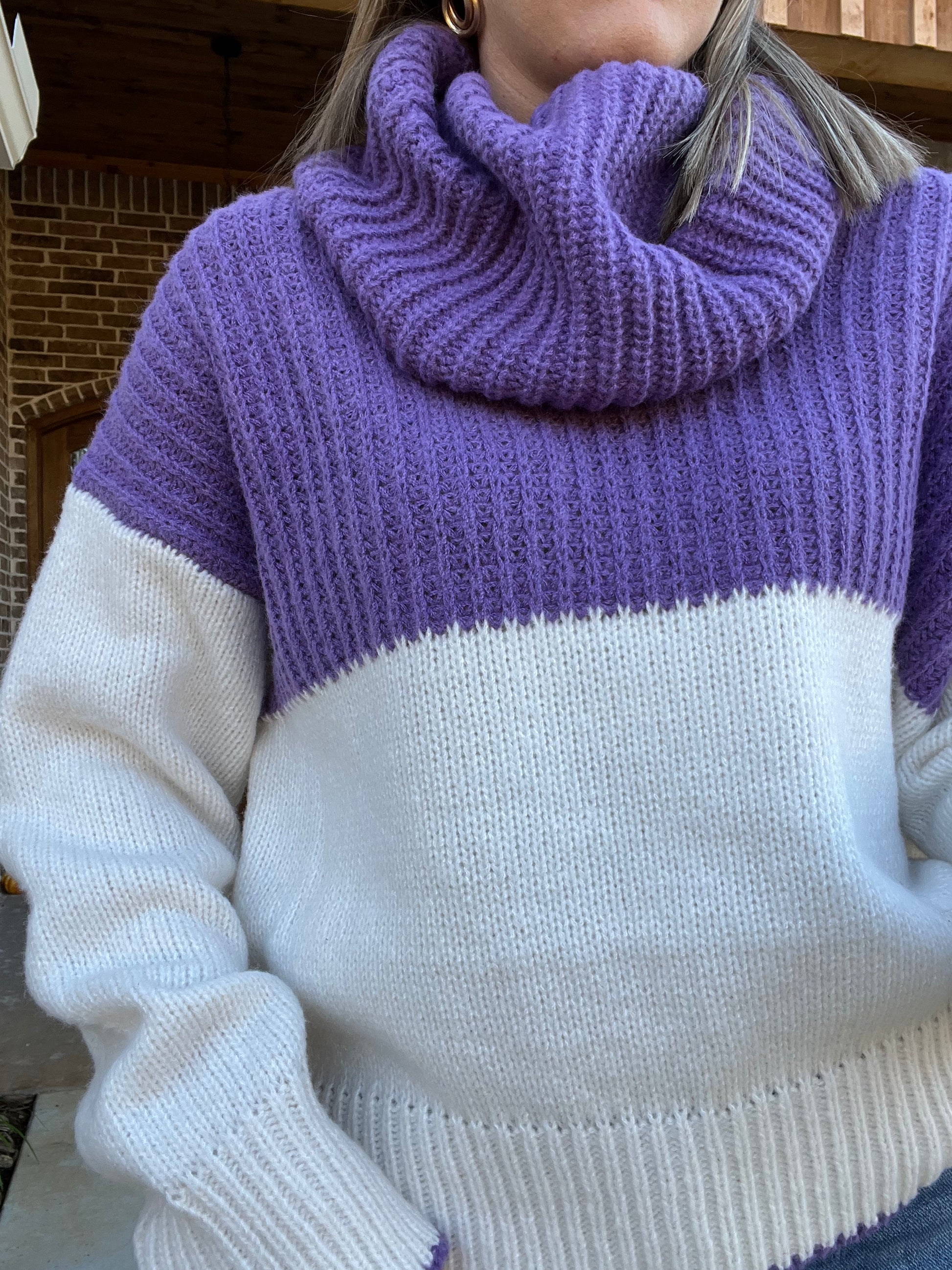 This turtleneck sweater is so cozy! Features colors of white and purple and flexible turtleneck.